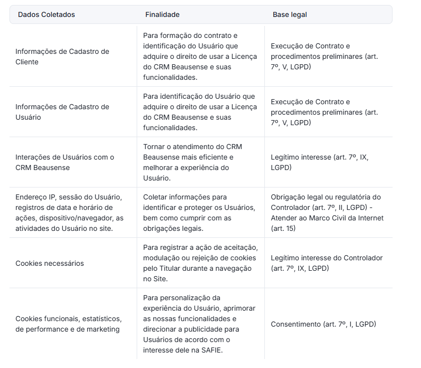 A Beausense pode compartilhar os dados necessários para que seja possível a manutenção das suas operações de forma eficiente. Ou seja, dados poderão ser compartilhados com empresas contratadas para que as funcionalidades do CRM Beausense estejam disponíveis e/ou para que forneçam uma melhor experiência para o Cliente e os Usuários.
